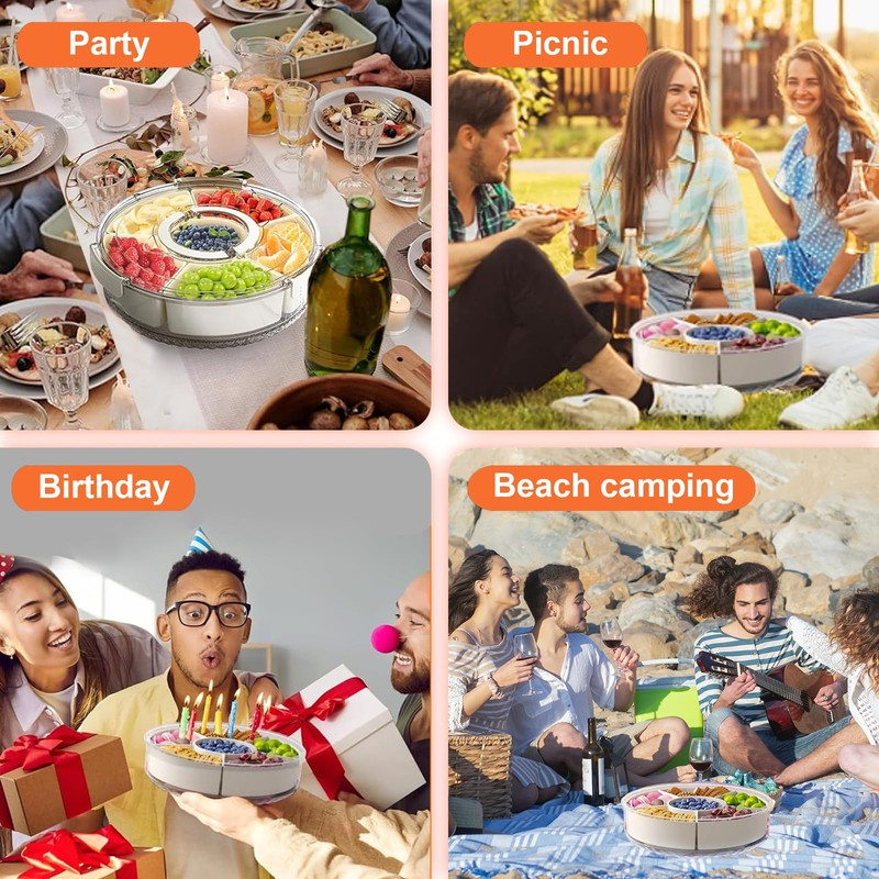 AYauGamA Divided Serving Tray with Lid and Handle, Portable Snackle Box Container for Fruits Snacks Charcuterie Organizer, Spinning Rounded Veggie Tray for Kitchen, Party, Travel and Picnic