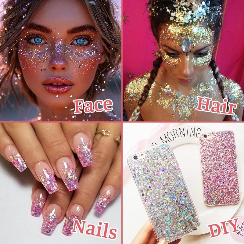 - 【Multi-purpose】This glitter gel is perfect for makeup and DIY art. It is perfect for face, body, eye shadow, lips, cheeks, nails, etc. It can also be used to decorate your home, mobile phone cases, glasses, cards, body painting, etc.