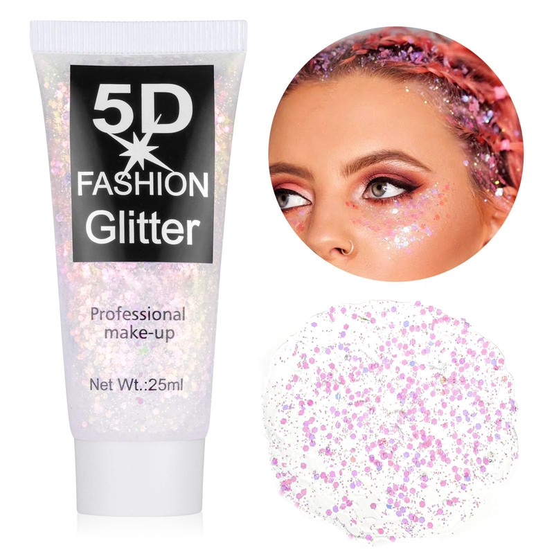 AYBUY Body Glitter Gel, Festival Glitter Face 25 ml, Sequins Chunky Glitter Liquid Gel, Mermaid Sequins Sparkling for Face Hair Lips Nails Make Up Cosmetics (Transparent Pink)