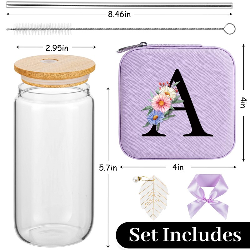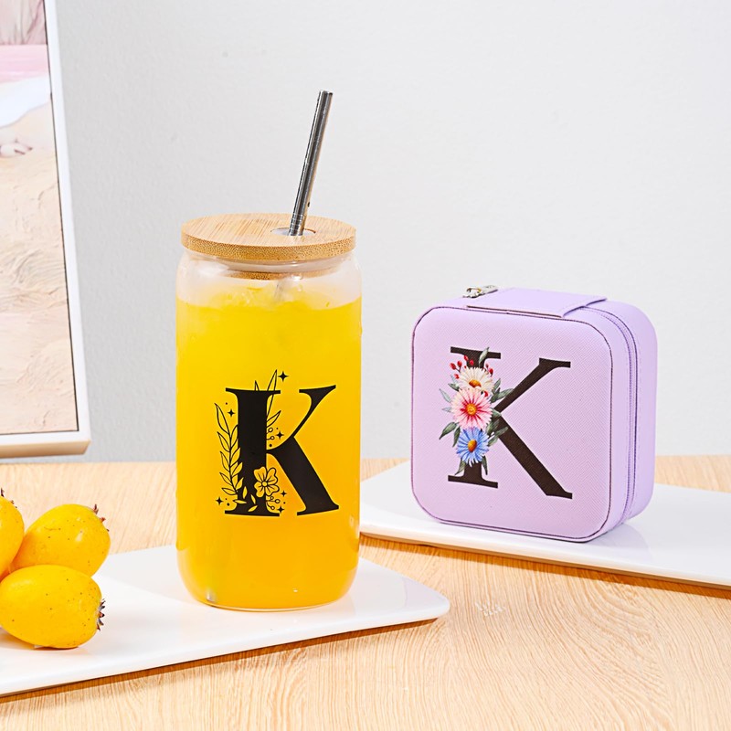 - 🌸Initial jewelry box and Glass with Bamboo Lid and Straw Set: personalized initial printed jewelry box and a 16 oz. glass with bamboo lid and straw, the jewelry box is made of high quality PU leather with eco-friendly nubuck lining, soft and luxurious, won't scratch your jewelry. jewelry box size: 3.93*3.93*1.8 inches, glass size: 2.95*5.7 inches, straw size: 2.36*8.46 inches