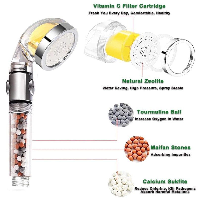 - 2. MULTI-STAGE FILTER: this filtered shower head is composed of stainless steel, Vitamin C filter cartridge with universal mineral blend of tourmaline, seoul stone balls for the best spa shower experience