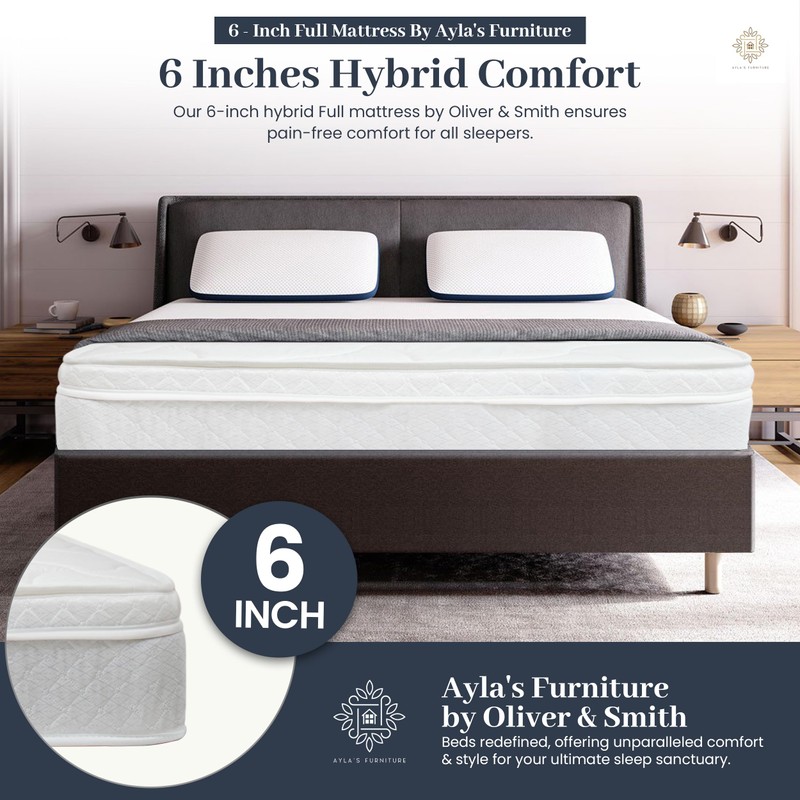 - 🌟 6-INCH HYBRID COMFORT: Sink into blissful slumber on our 6 inch full hybrid mattress by Oliver & Smith (made with 3 layers: comfort foam, high-density foam, and Bonnell coil springs, seamlessly blending premium cooling foam and responsive spring support. With our exceptional full-size mattress, which comes either in white or gray color, you can relish pressure relief, full bed mattress ensures uninterrupted sleep, and wake up rejuvenated every morning on mattress full size.