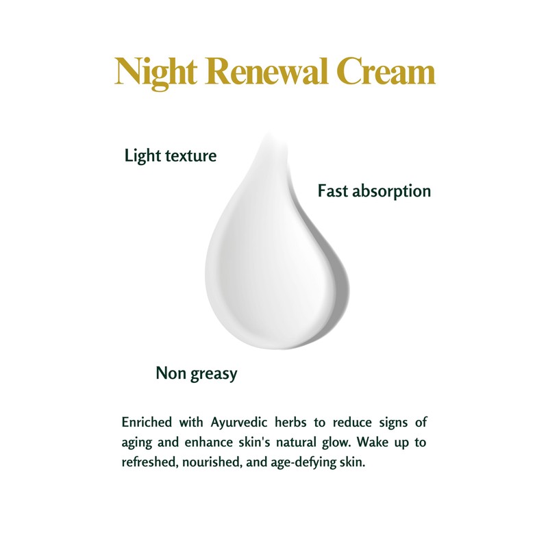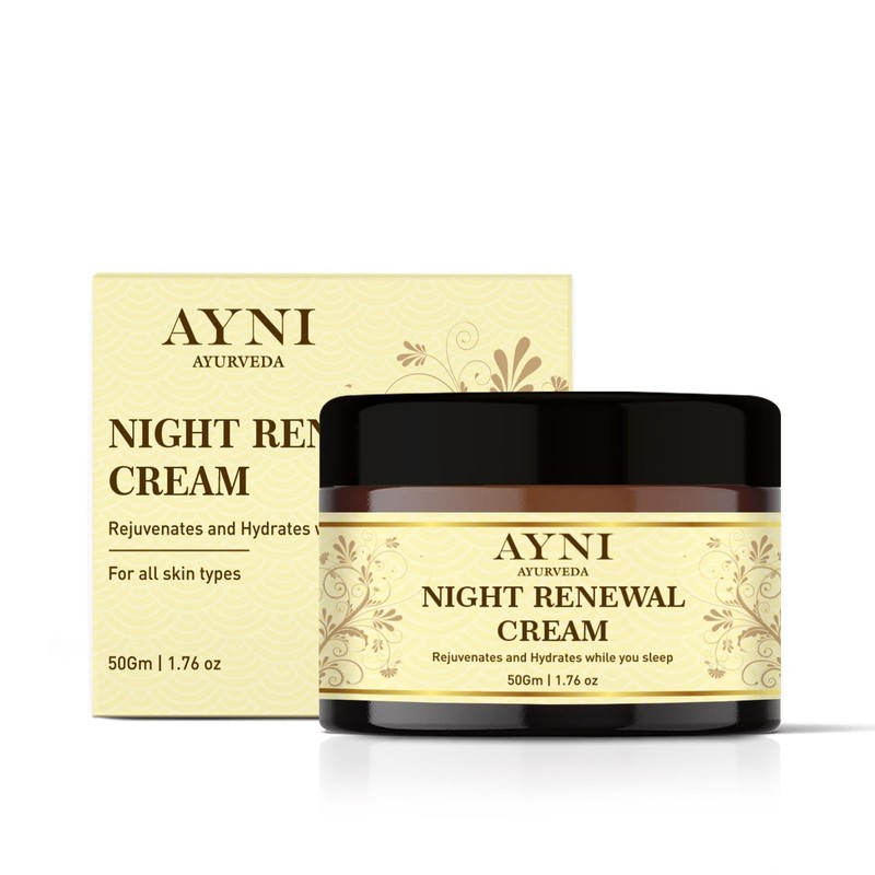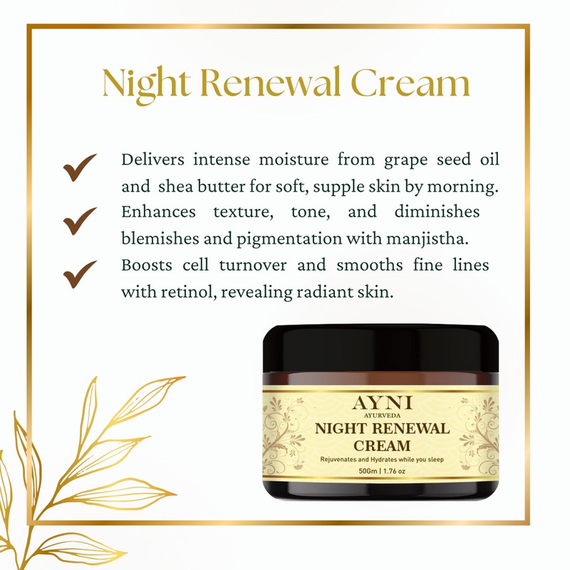 - NIGHT RENEWAL CREAM: Wake up to visibly refreshed skin with Ayni Ayurveda Night Renewal Cream, infused with Manjistha, Shea Butter, Grape Seed Oil, and Plant-Based Retinol. This nourishing formula supports collagen, smooths fine lines, and helps reduce the appearance of dark spots and uneven tone—ideal for aging, dull, or uneven skin