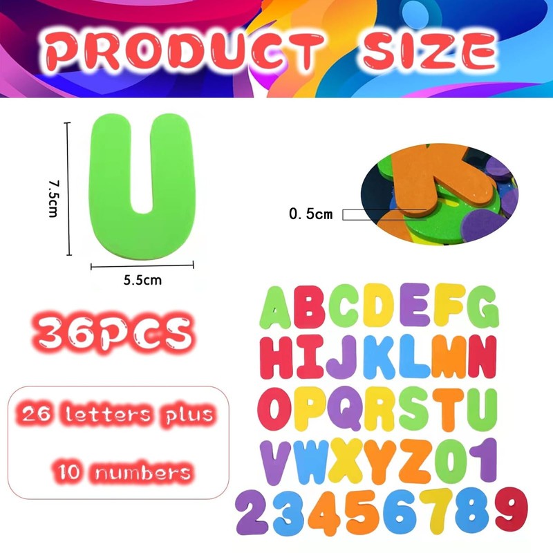 - NUMBERS ALPHABET SET: Inside the set is a total of 36 pieces, which contains 26 letters and 10 numbers, made of environmentally friendly and harmless EVA material, the size of each one is about 50mm*75mm*5mm, bright and colourful.