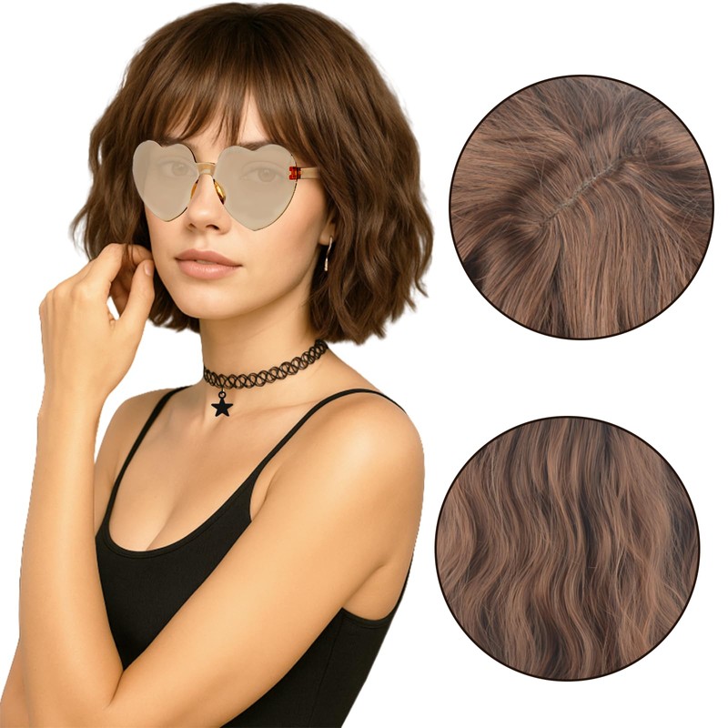 AYNKH Short Bob Brown Fringe Wig for Women with Accessories, Includes Wig Cap, Necklace, and Sunglasses, Suitable for Daily Travel or Attending Parties, a Fashionable Choice