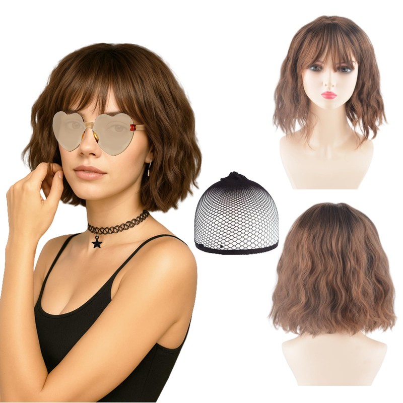 AYNKH Short Bob Brown Fringe Wig for Women with Accessories, Includes Wig Cap, Necklace, and Sunglasses, Suitable for Daily Travel or Attending Parties, a Fashionable Choice