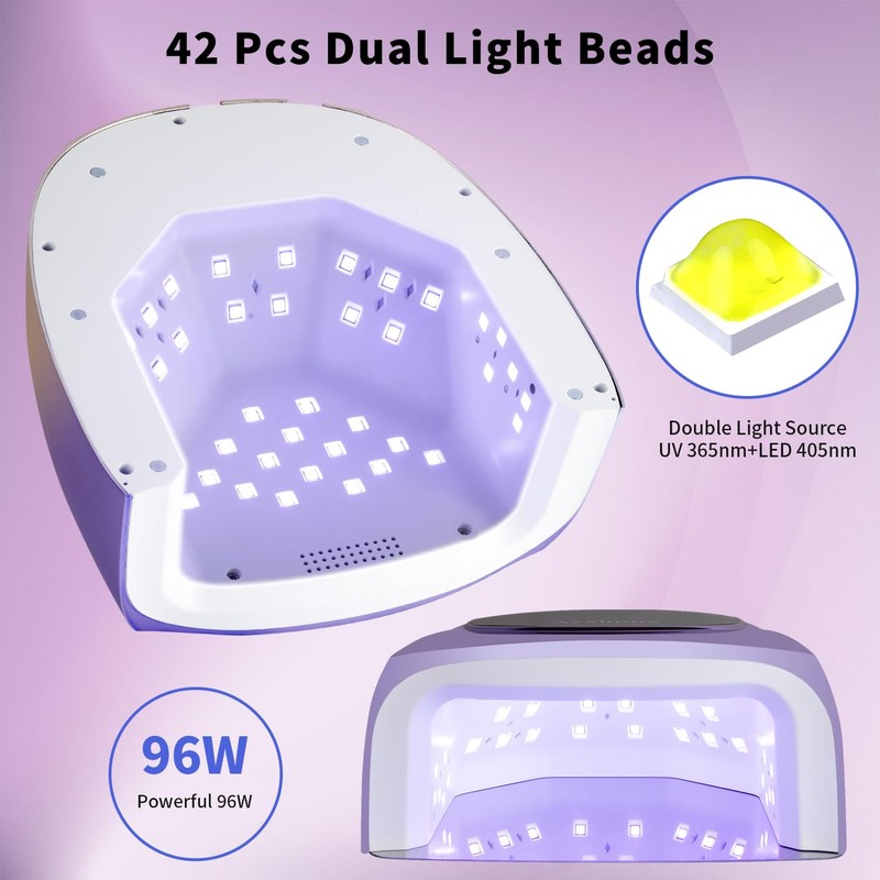 - 【Dual Light Source and Fast Curing Lamp】This lamp adopts advanced dual-light source technology to cure all kinds of nail gels. The 96W high power offer 50% faster curing speed than others nail lamp,you can enjoy professional salon nail art easily and freely at home with our gel nail light.