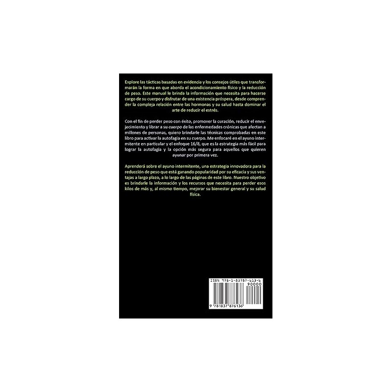 Explore las tcticas basadas en evidencia y los consejos tiles que transformarn la forma en que aborda el acondicionamiento fsico y la reduccin de peso. Este manual le brinda la informacin que necesita para hacerse cargo de su cuerpo y disfrutar de una existencia prspera, desde comprender la compleja relacin entre las hormonas y su salud hasta dominar el arte de reducir el estrs.Con el fin de perder peso con xito, promover la curacin, reducir el envejecimiento y librar a su cuerpo de las enfermedades crnicas que afectan a millones de personas, quiero brindarle las tcnicas comprobadas en este libro para activar la autofagia en su cuerpo. Me enfocar en el ayuno intermitente en particular y el enfoque 16/8, que es la estrategia ms fcil para lograr la autofagia y la opcin ms segura para aquellos que quieren ayunar por primera vez.Aprender sobre el ayuno intermitente, una estrategia innovadora para la reduccin de peso que est ganando popularidad por su eficacia y sus ventajas a largo plazo, a lo largo de las pginas de este libro. Nuestro objetivo es brindarle la informacin y los recursos que necesita para perder esos kilos de ms y, al mismo tiempo, mejorar su bienestar general y su salud fsica.