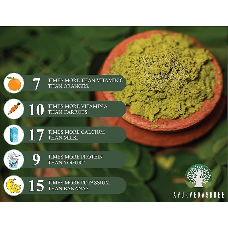• Moringa Leaf is one of the most nutrient-dense plants, it contains Amino acids, Antioxidants, and essential nutrients. If you are looking for a better source of Bio-available vitamins and minerals, then Ayurvedashree's moringa leaf powder is a perfect choice