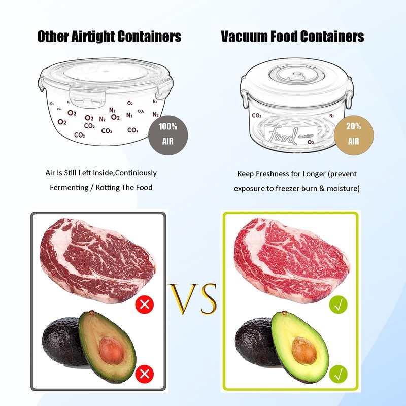 - 🥗【Vacuum Seal】: This vacuum seal container set uses advanced sealing technology to pump out the air and create a vacuum state, effectively preventing food from getting damp, spoiled, oxidized and losing flavor, extending the shelf life up to 5 times and keeping the original taste of food. You can enjoy fresh and delicious food anytime and anywhere with these containers.