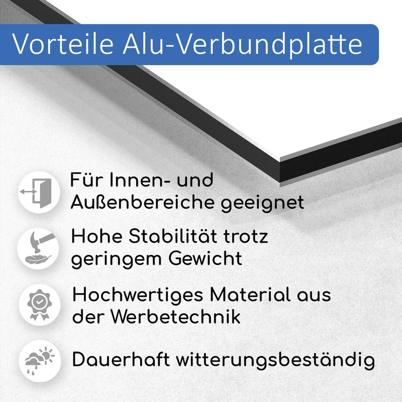 The aluminium composite plate has a PE core, which makes the sign particularly light and can also be easily drilled to the desired surface.