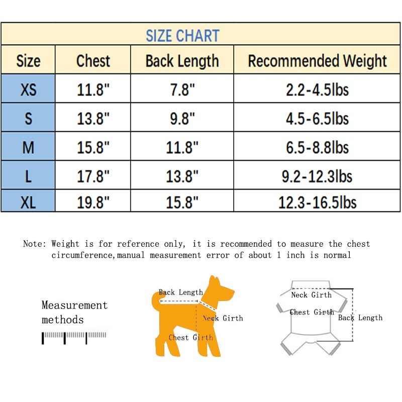 - 【Dress for cats dogs】: X-Small fit Chest 11.8”; Back 7.8”, weight about 2-4 LB, Small fit Chest 13.8”; Back 9.8”, weight about 4-6 LB,Medium fit Chest 15.8”; Back 11.8”,weight about 6-8 LB, Large fit Neck Chest 17.8”; Back 13.8”,weight about 9-11LB, X-Large fit Chest 19.8”; Back 15.8”,weight about 12-15.8 LB,this Fancy dog dress not for any medium large dog ,Pls choose large one if between 2 size