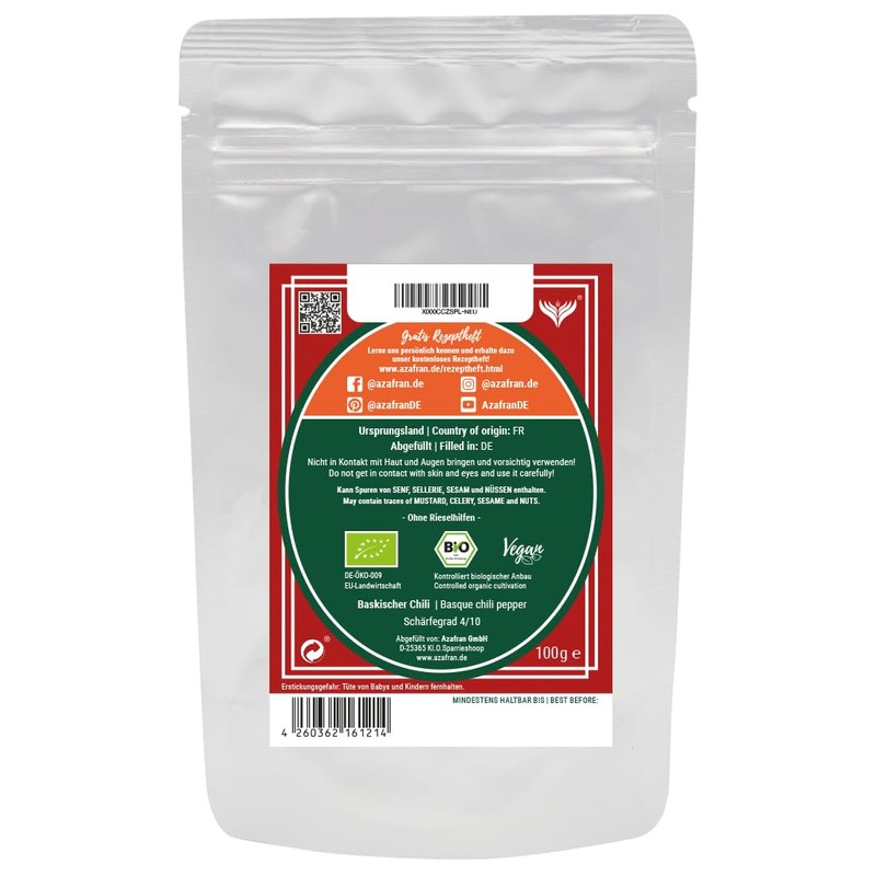 - Organic Basque chili from France. This chili is ground ground and comes from an original Frz. Manufacturer (AOP) made of Espelette and differs from the "original protected" allspice d'Espelette in that it was not bottled in a glass in France (but in an aroma bag in Germany). This chili is a highlight for any chili fan who wants less sharpness and more aroma