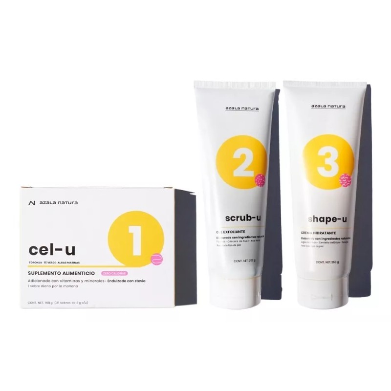 Kit Azala Natura básico, un tratamiento para atacar la celulitis desde todos los ángulos posibles. Incluye: un suplemento, un exfoliante y una crema que se complementan para mejorar la apariencia de tu piel.
