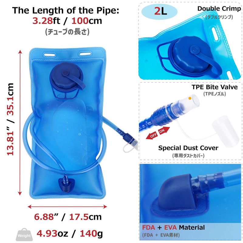 - 2L EVA Hydration Bladder: Made of durable and BPA free material to keep your water fresh and clean. The wide mouth design allows for easy filling and cleaning, while the leak-proof seal ensures nothing spills during your adventures