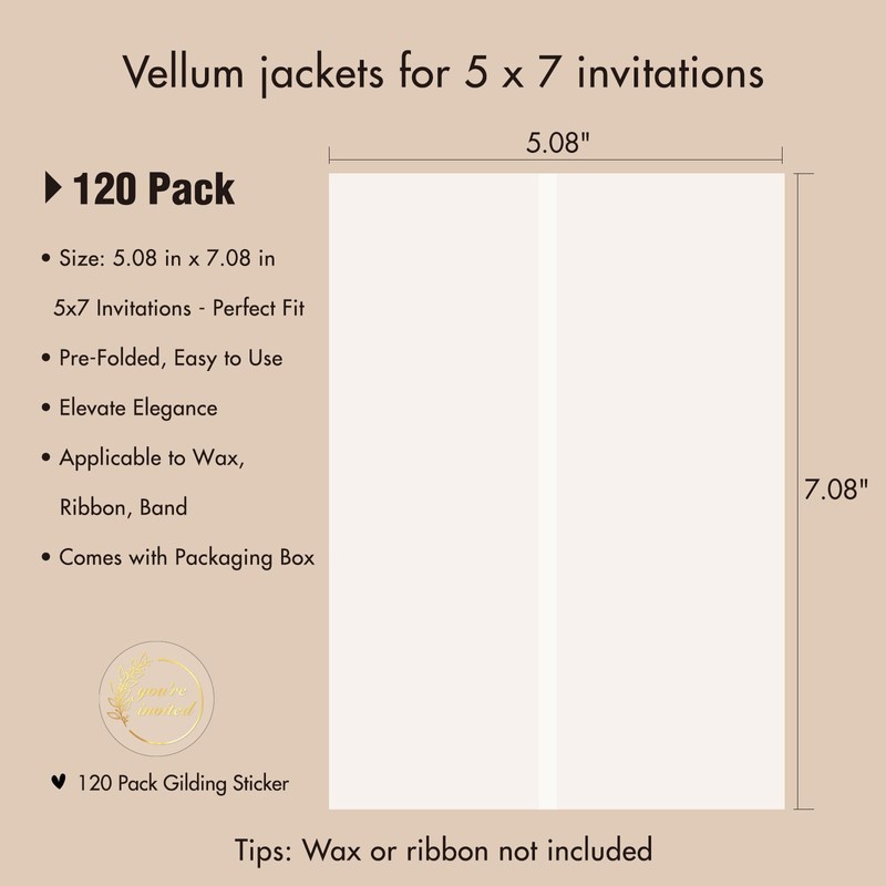 - 【Time-Saving & Easy To Use】 Our pre-folded vellum jackets for 5x7 invitations come ready to use, saving you time and effort. Say goodbye to tedious folding tasks. These vellum jackets feature a professional look, ensuring your invitation sleeves arrive in perfect condition to impress guests at any wedding invitation event. The velum jackets 5x7 design is easy to handle and assemble, making the process smooth and efficient.