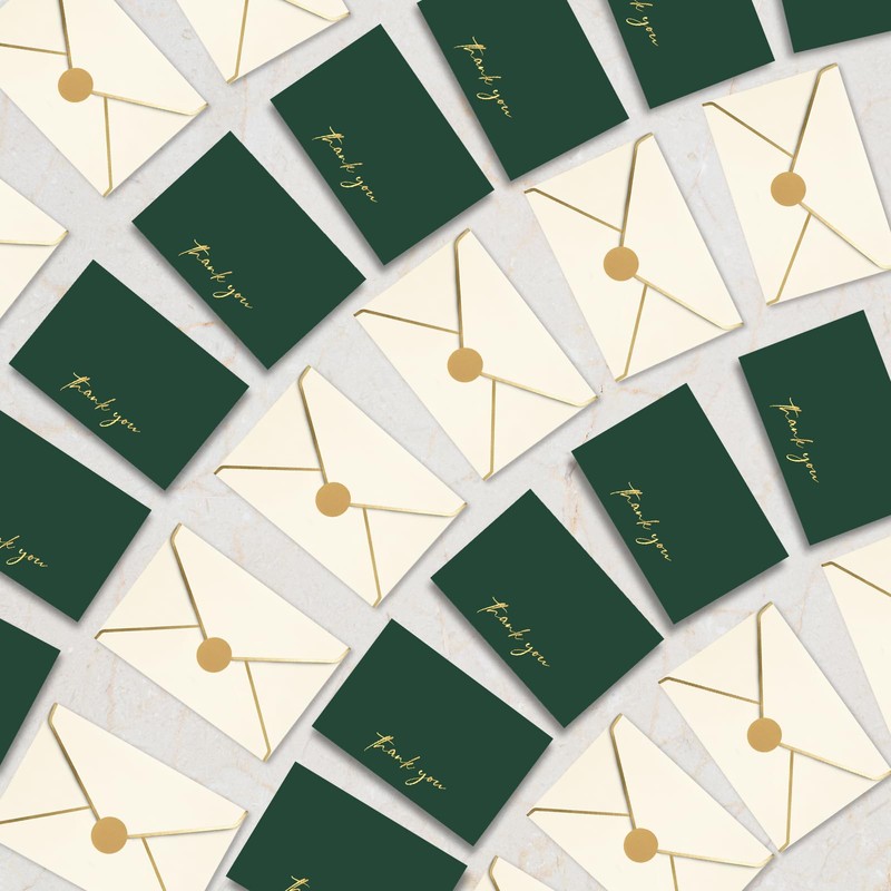 - 【Artist's Description】If you are still hesitating what color to choose, choose green! Green wedding thank you cards feature a simple “Thank You” in Gold Foil on the front and a blank interior for you to personalize. The matching golden border envelopes are AZAZA's star products, and the dot stickers make the whole set of AZAZA dark green thank you cards even more ceremonial!