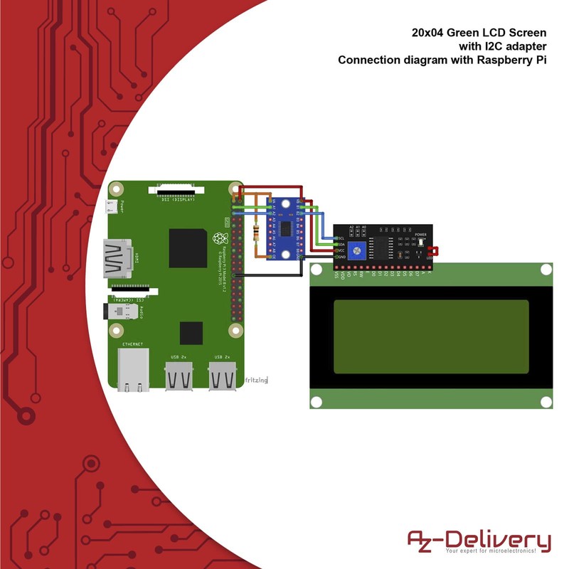 - The I2C display allows you to display 4 times 20 characters in black font on a green background.