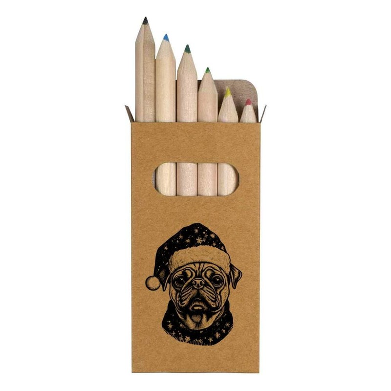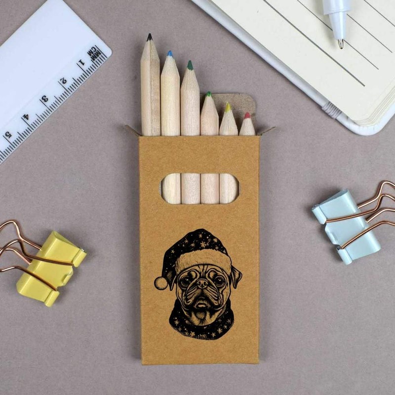 Azeeda 6 x 'Pug with a Christmas Hat on' Short 85mm Pencils/Coloured Pencil Set (PE00058332)