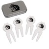 A fantastic gift for any golfer! This set includes 4 plastic divot tools / pitch forks, each printed on one side with a unique design. All 4 forks come in a small tin with a matching design printed on the lid.
