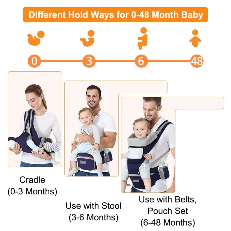 - 【Druckentlastung und Maximale Sicherheit】 - Breite verstellbare und gepolsterte Hüftgurte (71-125cm) und verstellbare Schultergurte üben die Druckentlastung für Mama und Papa beim Tragen des Babys, und der Hocker auf die maximale Sicherheit von Stoßdämpfern angebracht sind, schützen das Baby, geeignet für Baby, das 0-48 Monate alt ist.