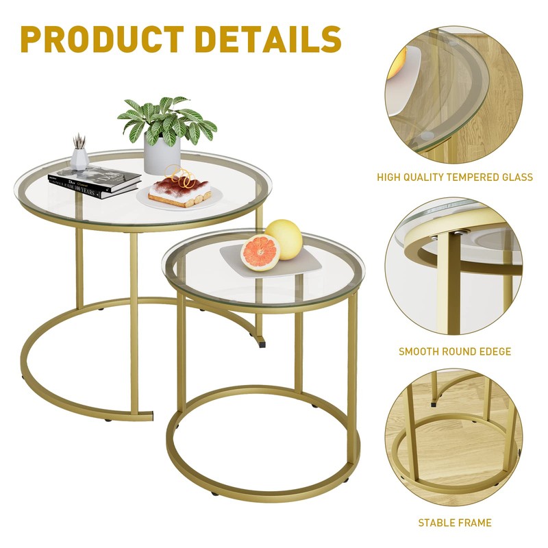 Azheruol Nesting Coffee Table Set of 2,Modern Gold Tempered Glass Side Table, Metal Frame Round End Table.Small Glass Tea Table for Living Room,Bedroom Studio Apartment Essentials,17.7IN
