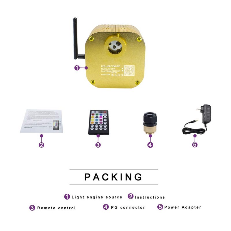 AZIMOM Fiber Optic light features the world’s most advanced LED Fiber Optic Technology, can achieve twinkle,voice control, color change and other functions, providing a more wonderful visual experience. Techincal Specification Input voltage:AC86-265V/DC12V POWER:16W COLOR:RGBW LED:RGBW LED Net Weight: 630g Gross Weight: 730g Light source device size:L110*W83*H110mm Fiber head inner diameter:20mm Light body material:Aluminum Remoter dimension: L85× W52 × H7mm Lifetime: 50,000 hours Warranty:2 years Package : 1*16W light box 1*PG connector 1*28keys remote 1*DC power adapter