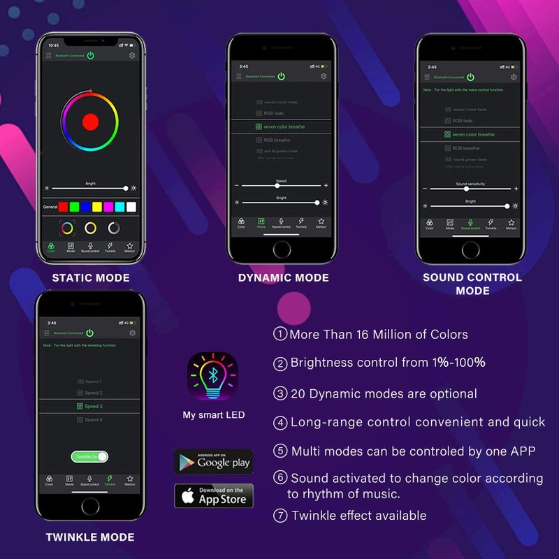 - 【Multi-color and Mode】DIY light effect what you like, adjust static colors ,jump, fade, flash breath mode, brightness, speed, even more than 16 million colors and multi-mode by APP/ Bluetooth control