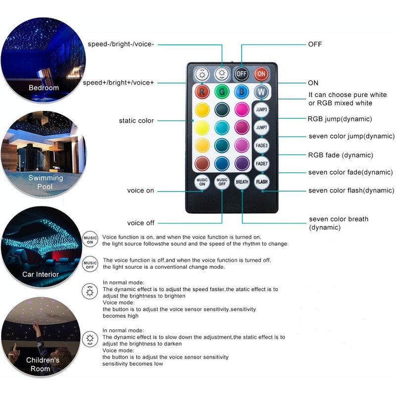 - 【Multicolor Lights & Dynamic Mode】: the fiber optic light can emit multicolor lights including 16 static colors and dynamic mode by remote, 16 million colors combining with static, dynamic(fade/jump/flash/breath), sound control by APP or Bluetooth control