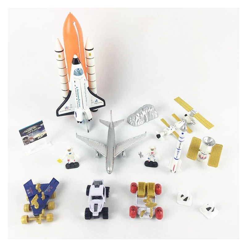 Includes space shuttle, 2 satellites, 2 rovers, 2 astronauts, 2 rockets, airplane, car, 2 cones, rock, signpost.