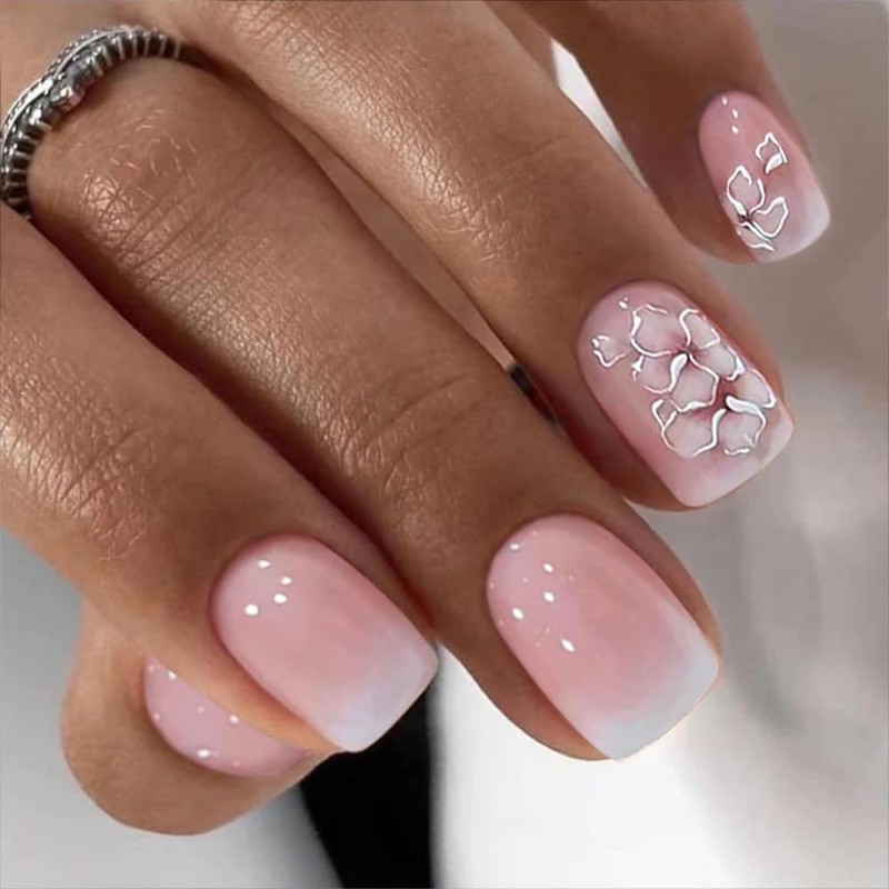 AZPEPSI Flower Press on Nails Short Square Fake Nails Pink Gradient False Nails with Design Pink Glue on Nails Reusable Acrylic Nails French Tip Glossy Pink Stick on Nails for Women Manicure 24PCS