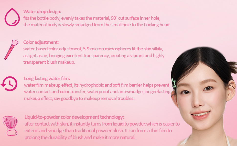 - Convenient Sponge Applicator: The teardrop-shaped sponge tip allows for precise application without smudging. The bottle comes with a control filter for easy control of blush application without smudging foundation.