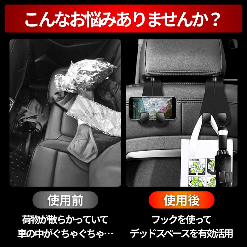 - [Product Details] Set of 2 car hetrest hooks. No tools required, just hook it over the headrest stay, and anyone can install it easily and fit a variety of vehicles. When not in use, you can change the angle to store it out of the way. The car hook can hang grocery bags, bags, tissue boxes, etc., which help you to create a neat and comfortable space in your car that tends to be cluttered