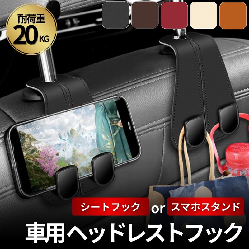 azumafy Car Seat Hook, Hetrest Hook, Set of 2, Car Hooks, Luggage Hooks, Double Hooks, Leather, Easy Installation, Convenient Goods, Accessories (Beige)
