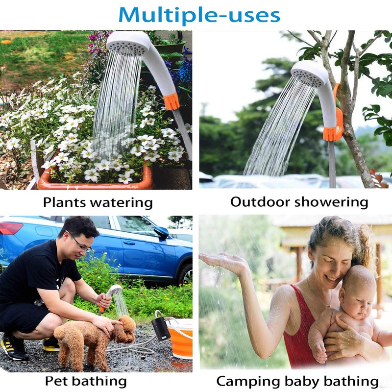 - EASY TO ASSEMBLE & STORAGE -- Connect tubes to pump & shower head, drop the suction pipe into the bucket of water, press the on/off button, ready to get a shower! Perfect for camping, hiking, kid bathing, pet cleaning, car washing, plants watering, windows and backyard cleaning.