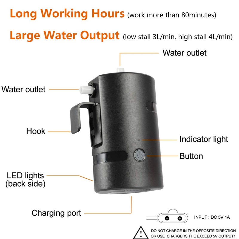 - CONVINIENT USB CHARGING -- Adopt USB rechargeable 4400mAH batteries, separated from the pump. No need to immerse the batteries into water, which can protect and enhance the batteries life. Differ from traditional design.