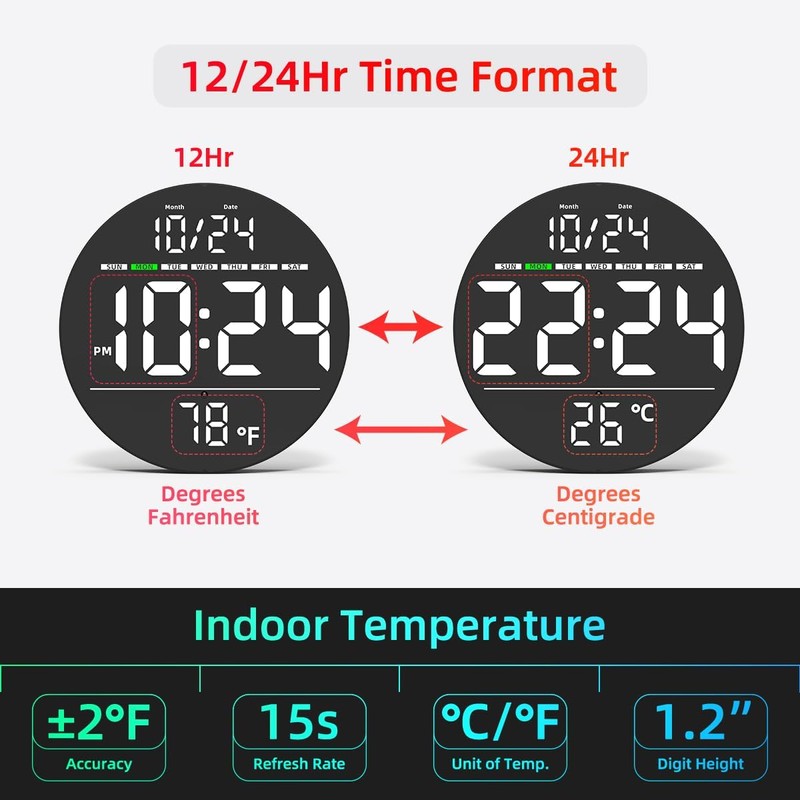 - With temperature measurement and suitable for various scenarios: the large wall clock has an integrated temperature sensor with an accuracy of ±1.5°C. The data is updated every 15 seconds, which is very suitable for accurate measurement of dynamic room temperature. It is ideal for bedrooms, living rooms, bathrooms, garages, offices, warehouses, farmhouses, kitchens, classrooms, gyms and many other places
