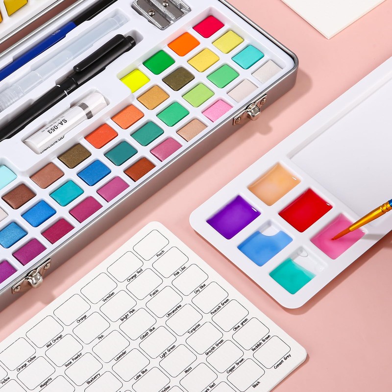 - Watercolour set 128 colours: with 84 classic colours, 4 fluorescent colours, 36 metallic colours, 4 macaroon colours, 1 watercolour brush, 10 nylon brushes, 1 marker, 1 palette, 1 pencil sharpener, 1 sketch pencil, 1 colour card, 8 sheets of watercolour paper, 1 natural sponge, 1 eraser, and portable tin. Take this practical set with you wherever you go!