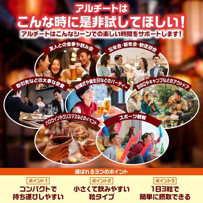 - ✅飲む人の新習慣!「アルチート」 楽しい会食を 最後まで 楽しみたい そんな貴方へ 注目成分「酢酸菌抽出物」配合!