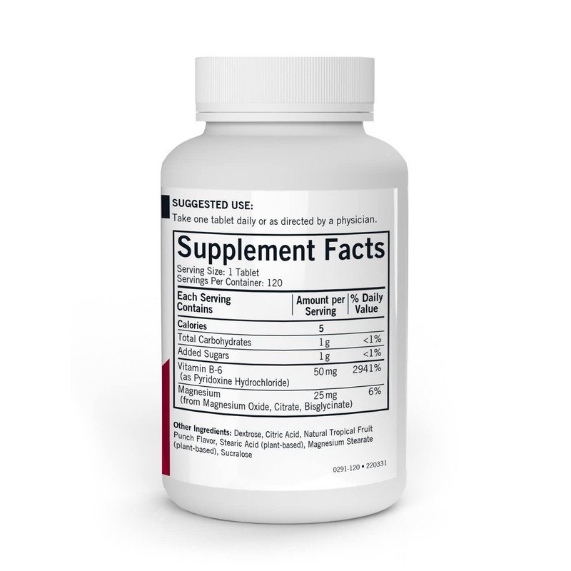 - CHEWABLE B6 SUPPLEMENTATION: Each serving provides 50mg of vitamin B6 and 25mg of magnesium in a tasty chewable tablet with natural tropical fruit punch flavor.