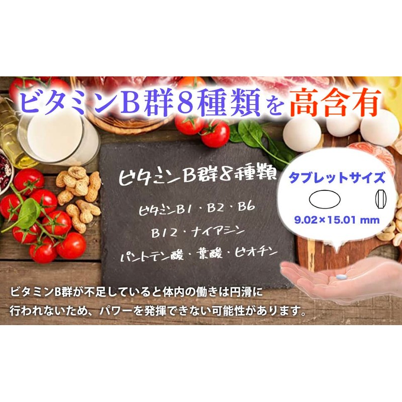 - 成分名(2粒あたり):エネルギー4.7kcal,タンパク質0.24g、脂質0.04g、炭水化物0.84g、食塩相当量0.0005g、ビタミンB1 50.0mg、ビタミンB2 50.0mg、ナイアシン50.0mg、パントテン酸 50.0mg、ビタミンB6 50.0mg 、ビタミンB12 50.0㎍、ビオチン50㎍、葉酸 200㎍、イノシトール90.0mg、コリン50.0mg
