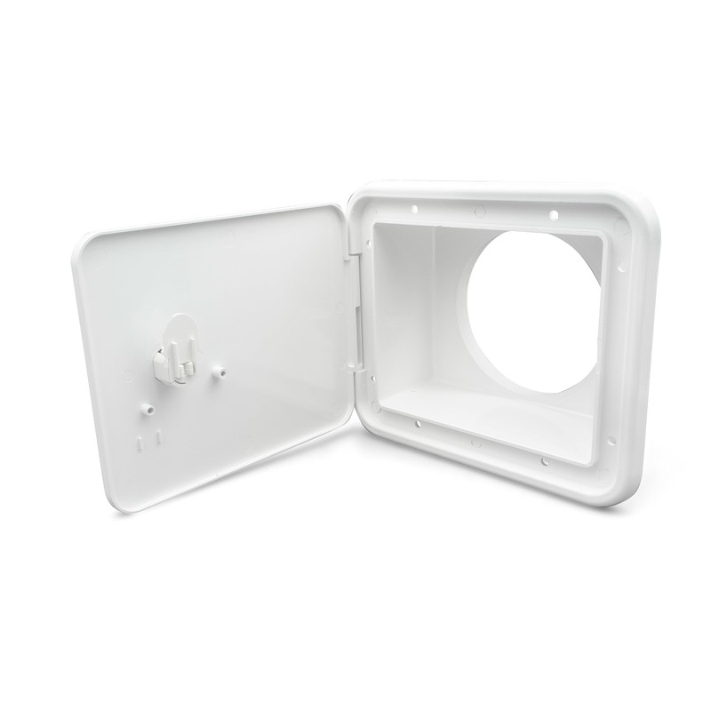 - Back plate accepts a 4" rigid PVC or flexible hose to create a storage area