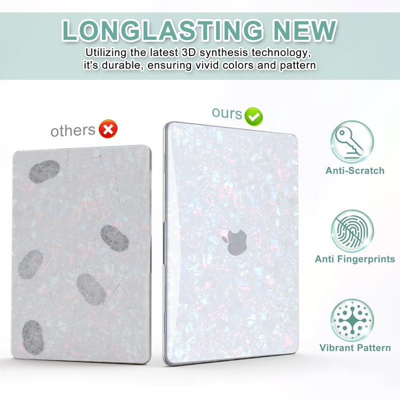 - Complete Bundle: The package includes 1 glitter pearl shell top case, 1 matte clear bottom case, 1 clear keyboard cover, and 1 screen protector. Additionally, please get in touch with us if you encounter any problems, we will work to make it right
