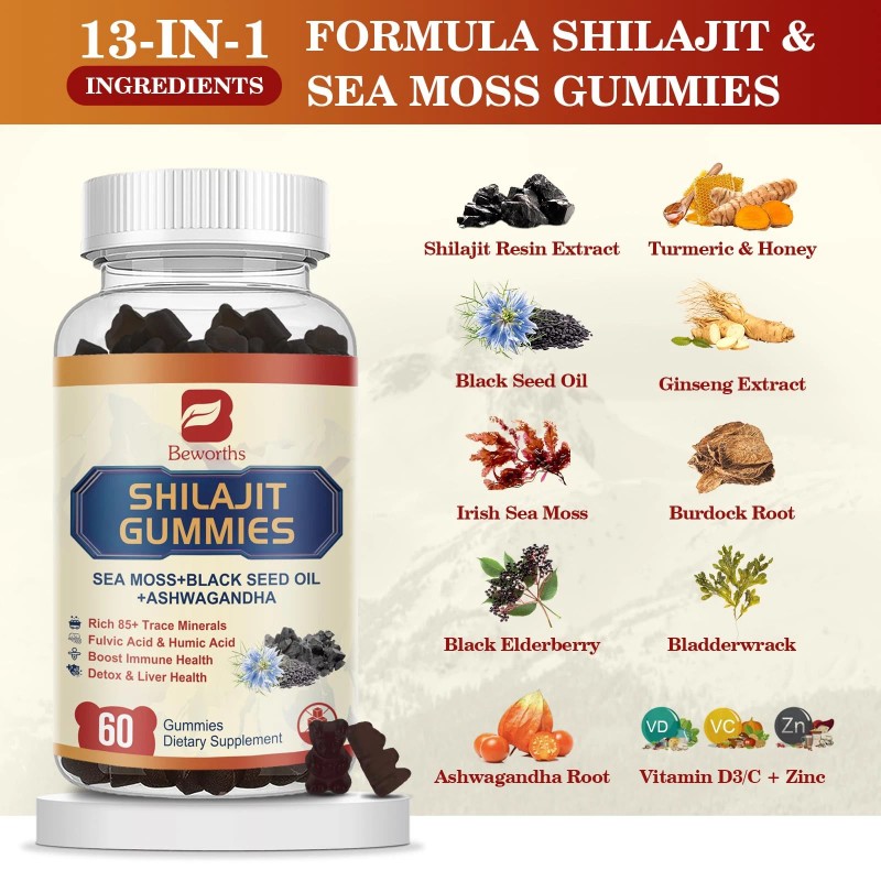 - 【13-In-1 FORMULA OF SHILAJIT SEA MOSS and ASHWAGANDHA COMBO】- Our high-quality and effective shilajit gummies for men are made from natural ingredients, containing 10000mg of pure Shilajit resin. Loaded with a potent blend of Shilajit Resin, irish sea moss, black seed oil, ashwagandha ginger, Panax Ginseng, Turmeric, Elderberry, Honey, Burdock, Bladderwrack, vitamin C, D3 and zinc, and a variety of other herbal extracts, the 13-in-1 formula offers an abundance of benefits. The perfect Sea Moss and Black Seed Oil is known for immune support and the combination formula Shilajit from potential energy enhancement to overall wellness.