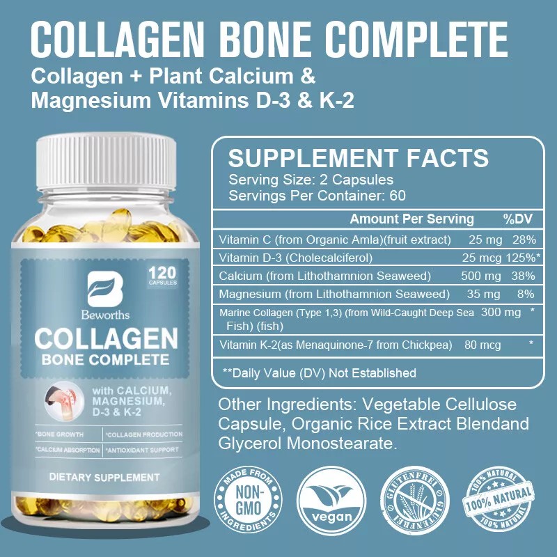 BEWORTHS Collagen Bone Complete Capsules Formula with Plant Calcium & Magnesium for Bone Growth Collagen Production Calcium Absorption Antioxidant Support