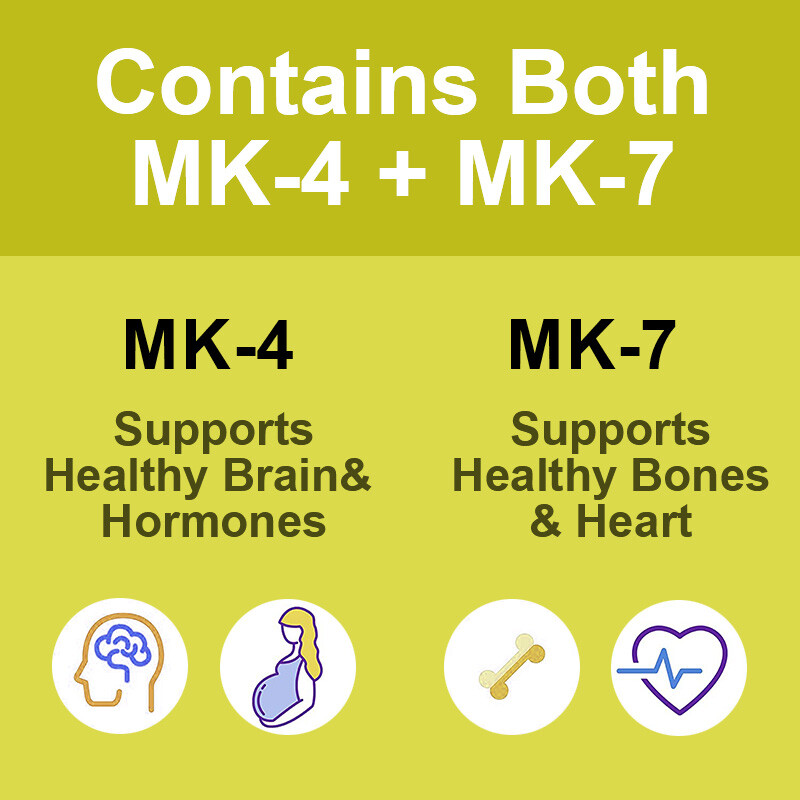 CONTAINS MK-4 AND MK-7: MK-4 and MK-7 are distinct vitamins and play separate roles in your health. Only MK-4 is found in the brain, fetus, and breast milk. MK-4 is the predominant K2 in the body. MK-7, which goes to work in the bones, is longer acting.