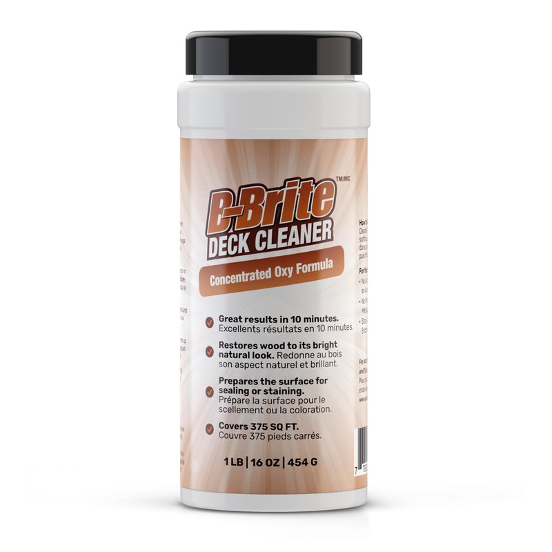 B-Brite Deck Cleaner: The Ultimate Cleaning Solution for Wooden Outdoor Spaces Revitalize Your Wooden Structures in Minutes, Not Hours! Unveil the original beauty of your wooden decks, railings, fences, and siding with B-Brite Deck Cleaner. Our concentrated formula works swiftly, giving visible results in as little as 10 minutes. This outdoor friendly powder concentrate is safe for your lawn and plants and comes in easy-to-use pouches. With just one pound (454g) of B-Brite, you can make up to 2 gallons of powerful cleaning solution, covering 375 sq ft of space.