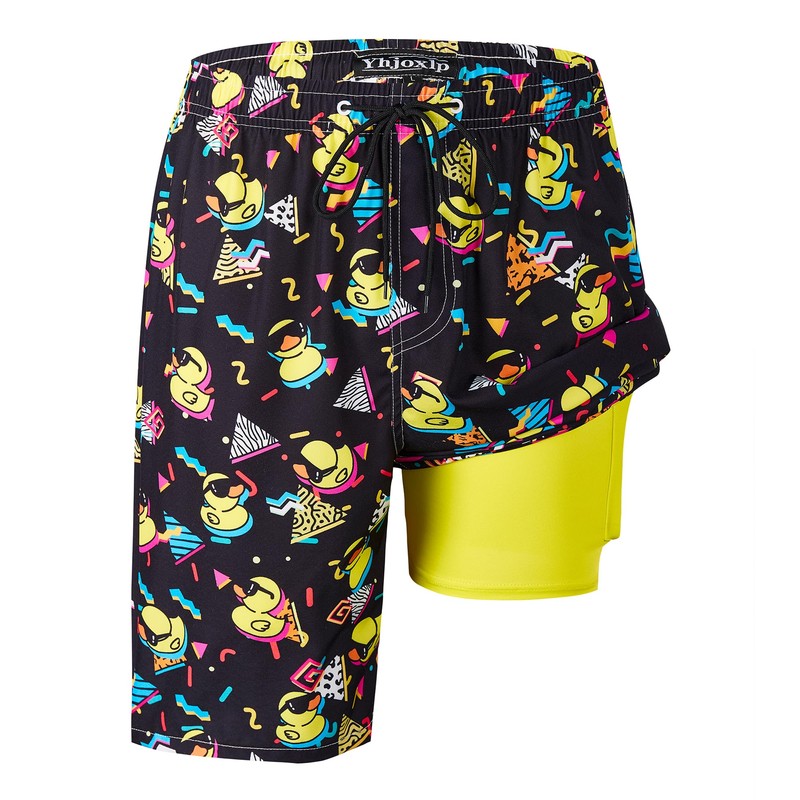 B BSUFTRO Mens Swim Trunks with Compression Liner, Yellow Duck Men Bathing Suit with Boxer Brief Liner 9 Inch Inseam Men's Board Shorts Swimwear, 4 Way Stretch Beach Shorts Quick Dry Swimsuits, XL