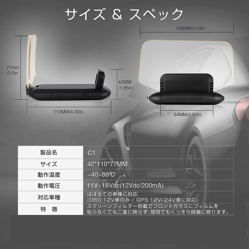 - HUD Head-up Display, C1, OBD2 + GPS 27 Functions + 48 Types of Full Car Data, Large Screen, Double Display, Multi-purpose Display, Japanese Instruction Manual Included, Speedometer, Tachometer, Water Temperature Meter, Battery Voltage, Fuel Economy, Altitude Altitude Altitude Warning Function