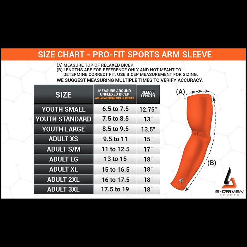 The B-Driven Sports Pro-Fit Compression Arm Sleeve offers durable performance for athletes and active lifestyles. Made from 220GSM polyester/lycra, it wicks moisture and dries fast during baseball, basketball, football, or gaming. Adjustable UPF 50+ to 20+ blocks UV rays in summer and retains warmth in winter. Engineered compression boosts blood flow, reduces muscle vibration, and minimizes post-activity fatigue to aid bruising reduction. Available in S-XXL for men, women, youth, and kids, the breathable fabric cools in heat and insulates in cold. Shields against turf burns and dirt outdoors, with machine-washable durability. Care includes air-drying and avoiding damp storage. Built for training, sports, or daily wear, it blends practicality and performance for dedicated athletes.
